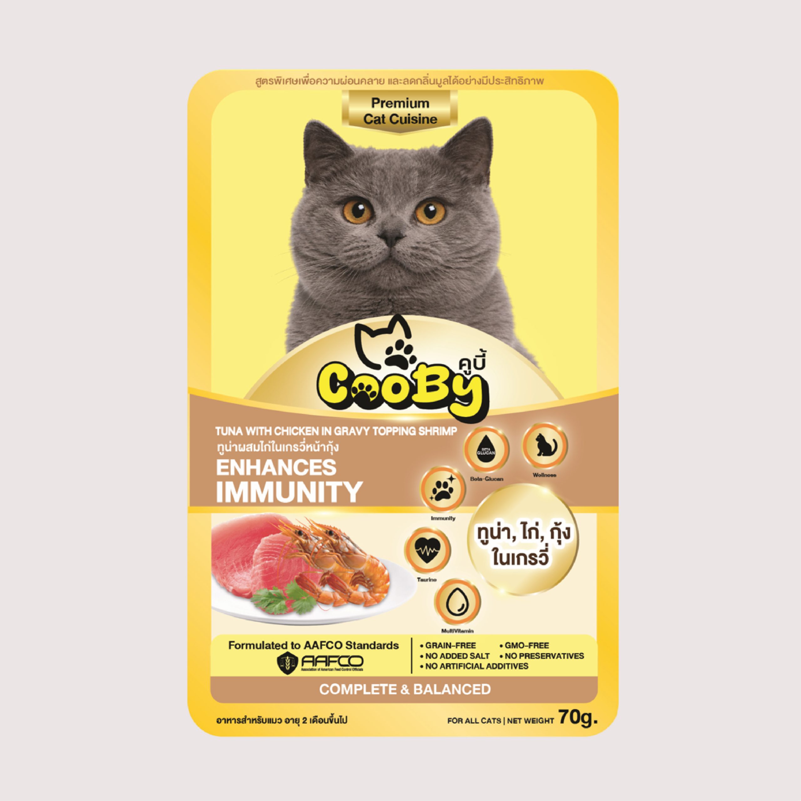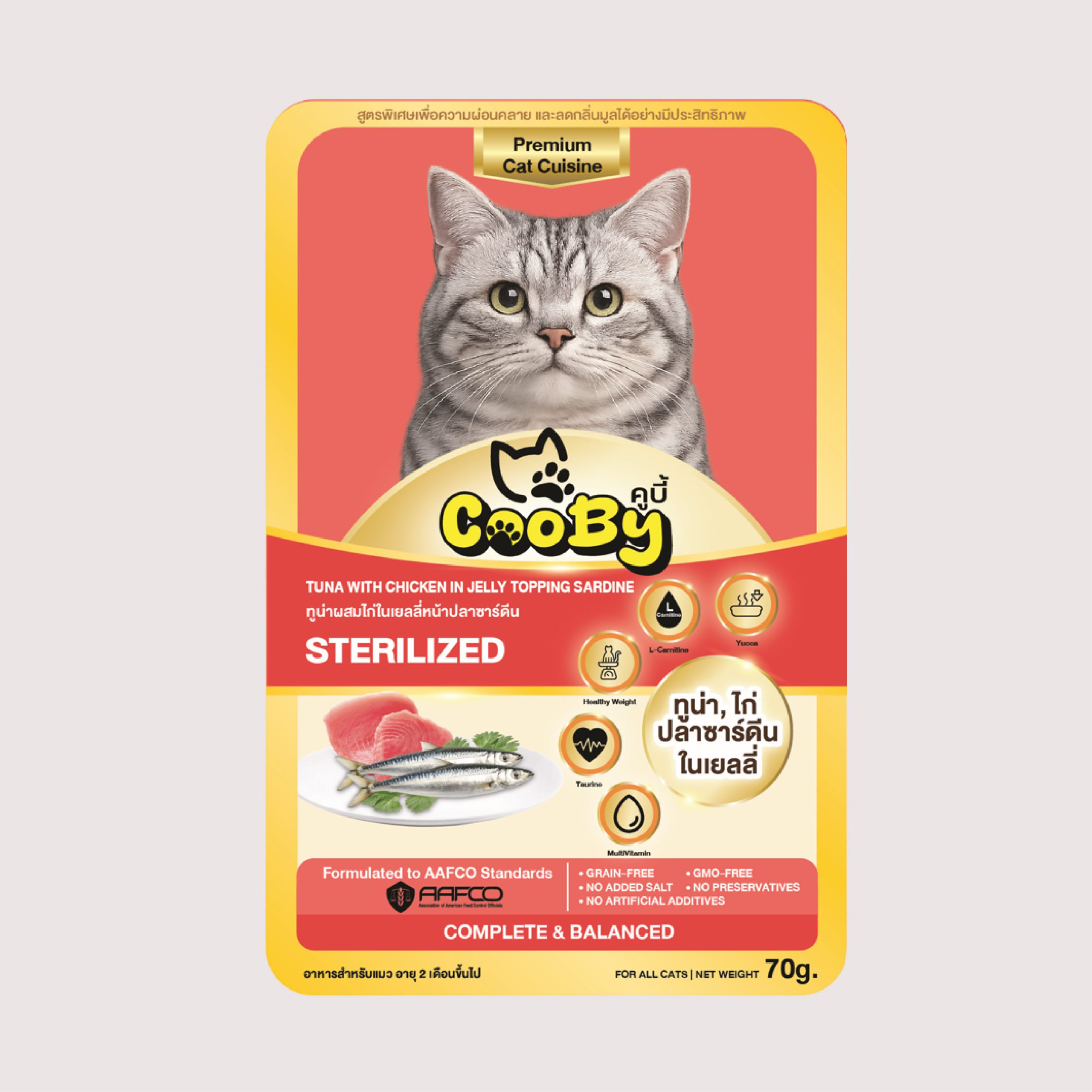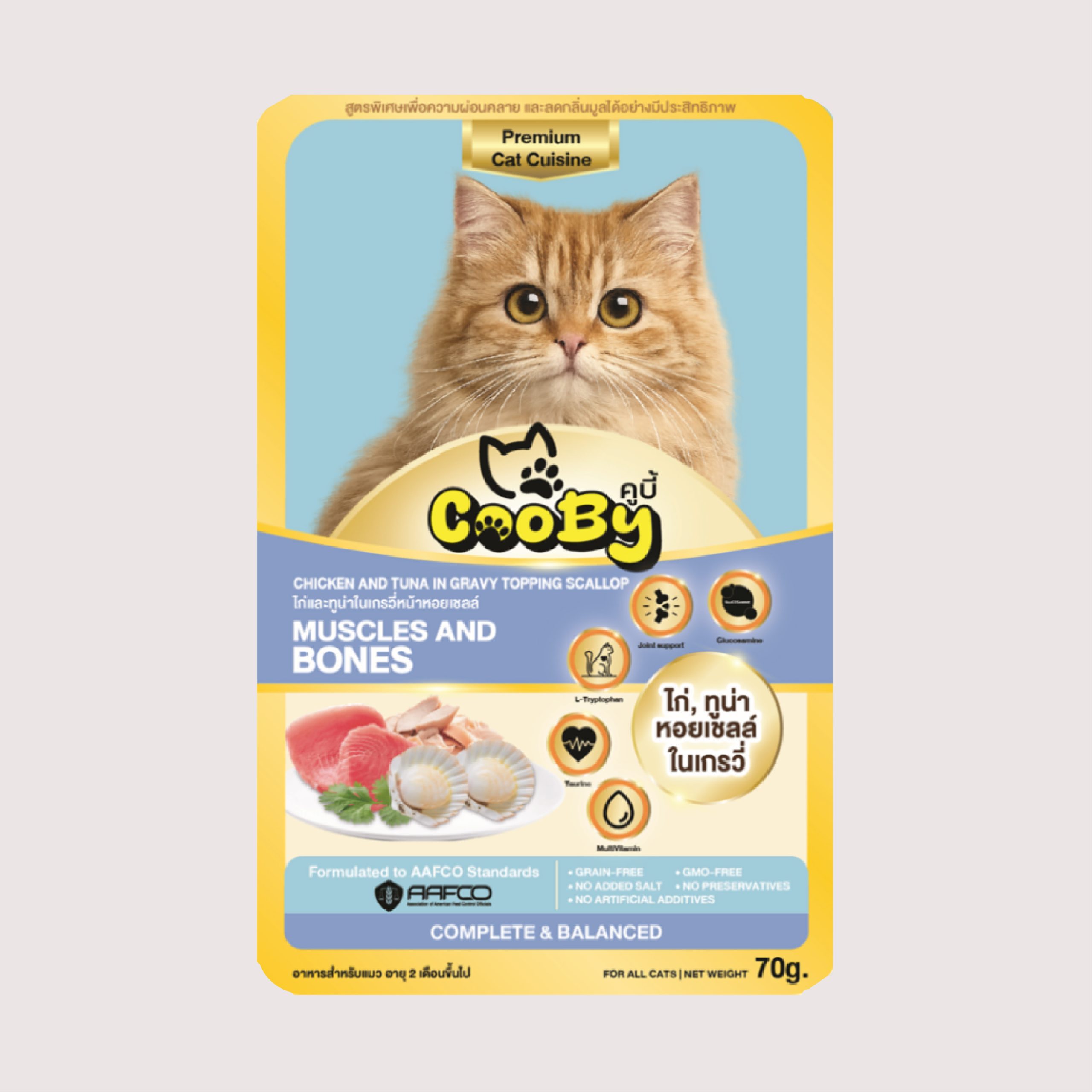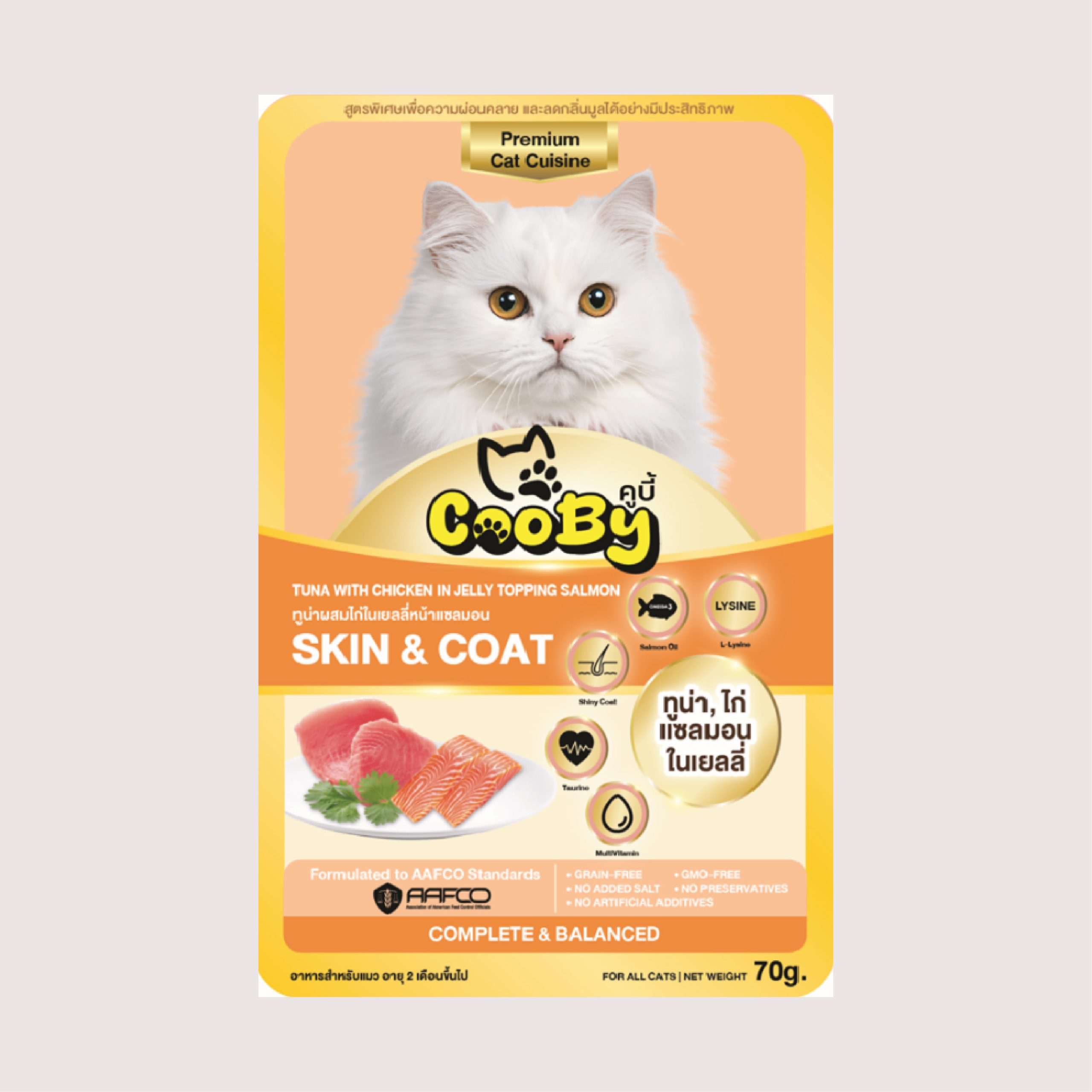 ผลิตภัณฑ์นี้มีเนื้อปลาและไก่ อาจไม่เหมาะสำหรับแมวที่มีประวัติแพ้วัตถุดิบดังกล่าว